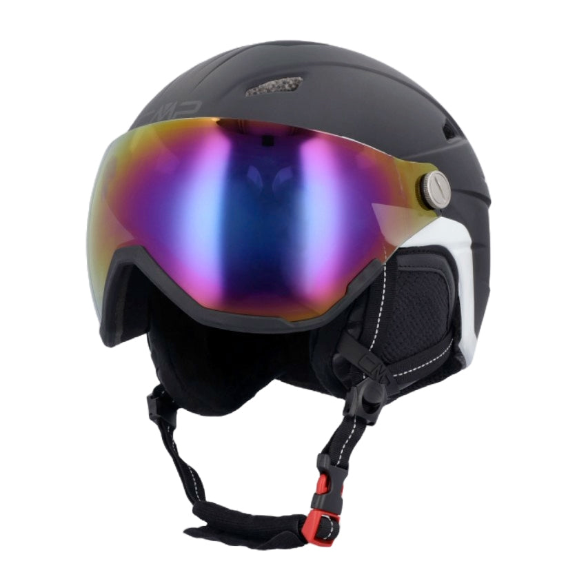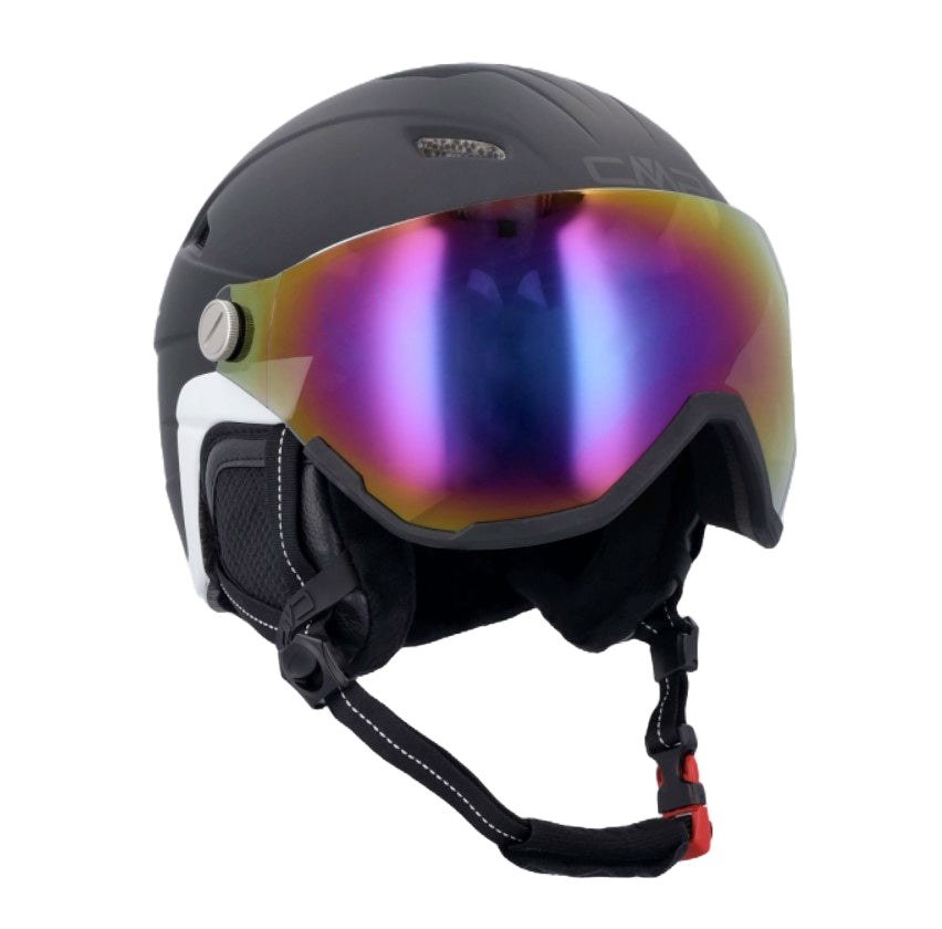 La visiera integrata S2 in policarbonato ultra resistente è anti-graffio, anti-fog e anti-UV, proteggendo gli occhi dai raggi nocivi e dagli appannamenti. Comoda, sicura e versatile, con cordino regolabile e sistema di ancoraggio per maschera, certificata CE EN 1077-B.