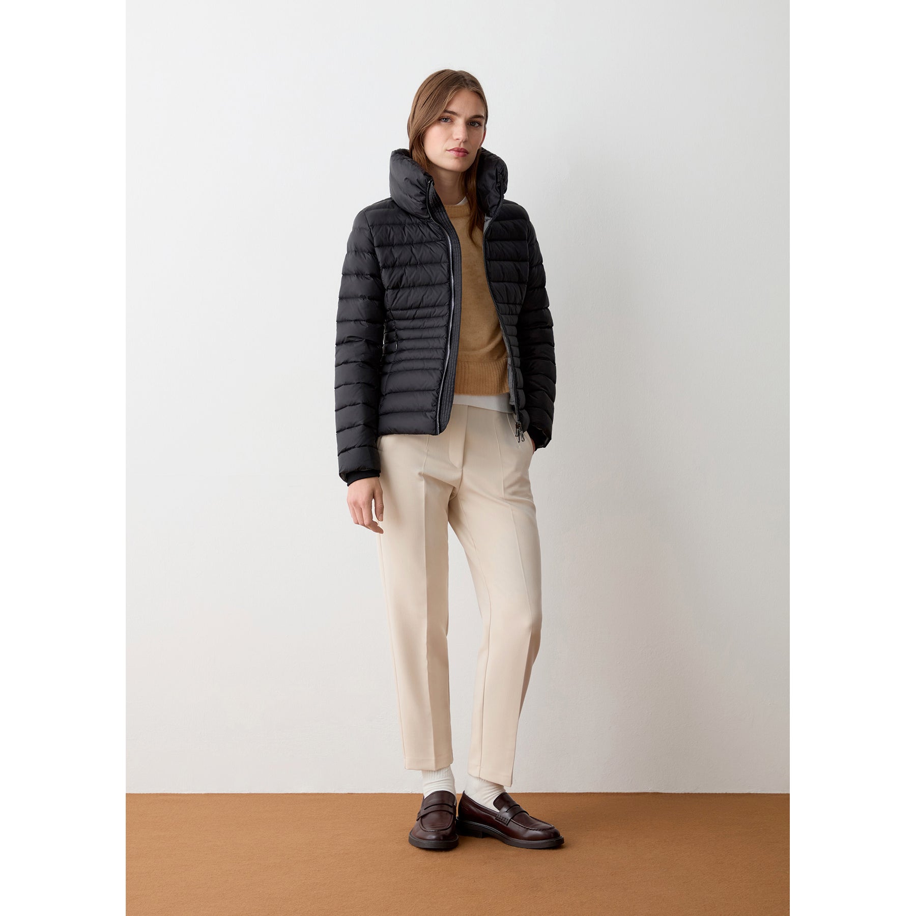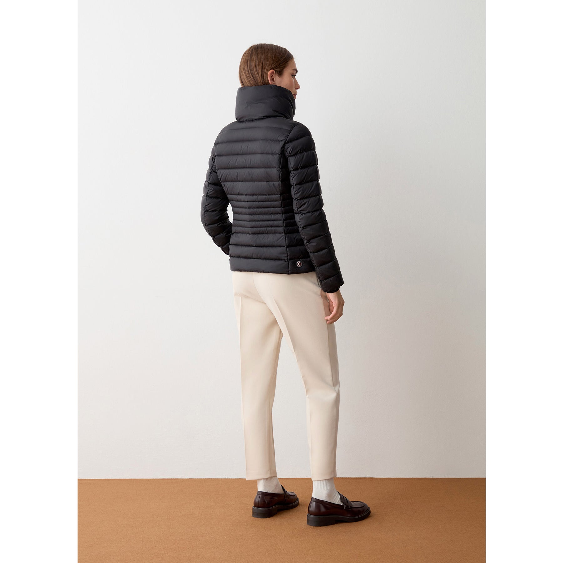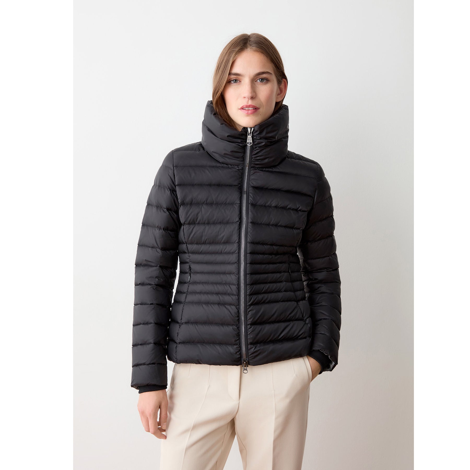 Giacca da donna realizzata in tessuto 100% riciclato con effetto cangiante e trattamento idrorepellente. Trapuntature più fitte segnano il punto vita e modellano la figura. Il collo, alto ed avvolgente, ed i polsi in maglia a costine la rendono perfetta per la stagione invernale.