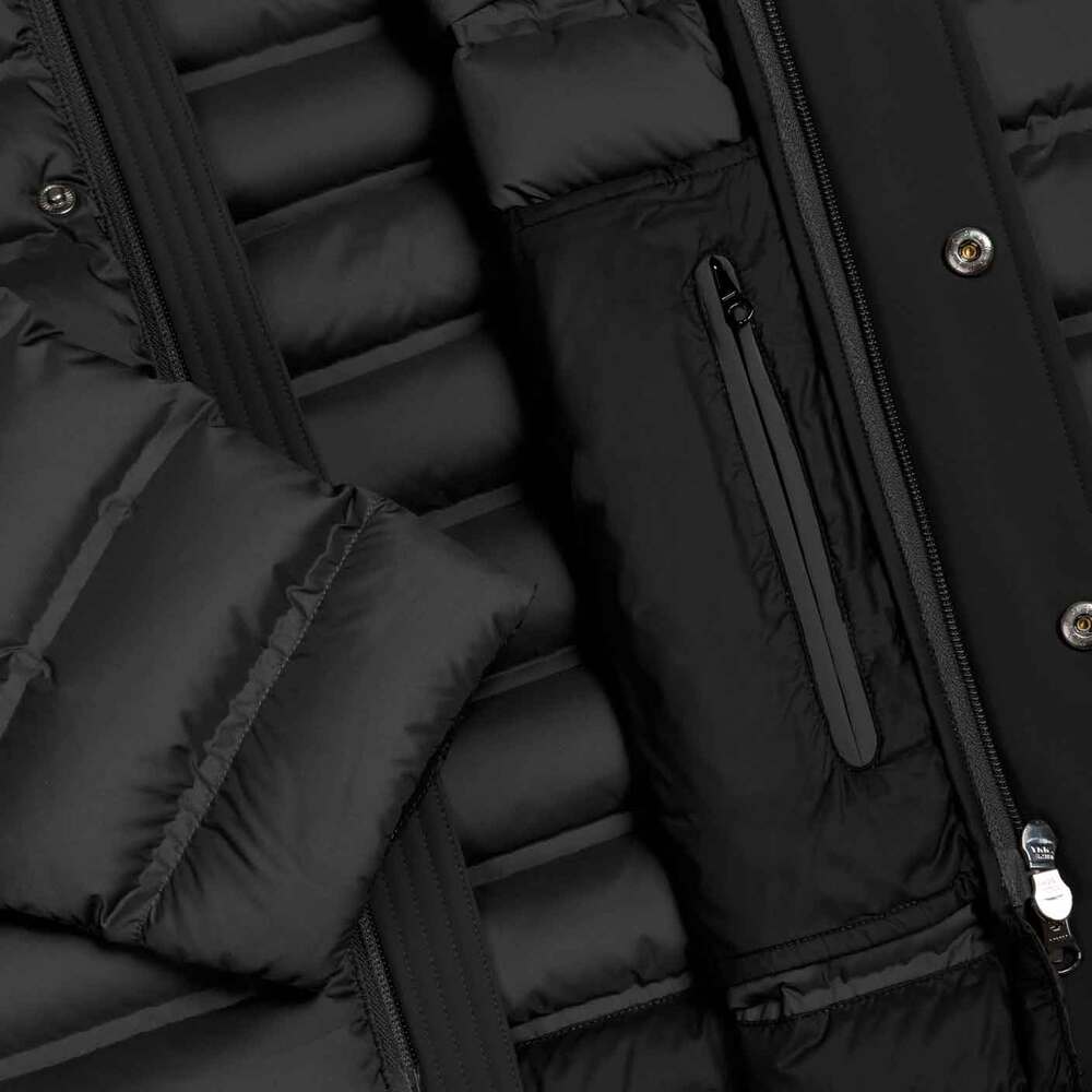 Il cappuccio staccabile con coulisse consente di personalizzare il look, mentre le tasche laterali e quella sul petto, tutte con chiusura a zip, aggiungono un tocco di funzionalità. La coulisse sul fondo permette di regolare la vestibilità, assicurando protezione e comfort anche nelle giornate più rigide.