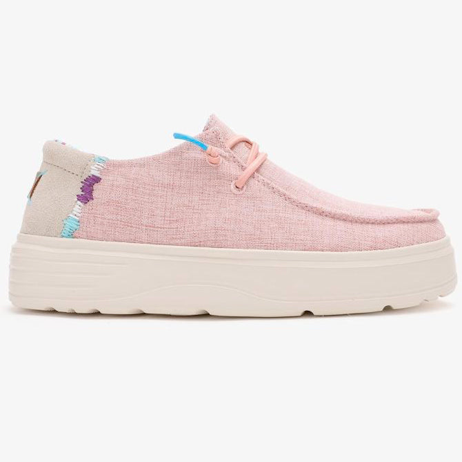 La tomaia è realizzata con un mix traspirante e resistente di poliestere, cotone e lino, arricchita da raffinati dettagli in camoscio. La fodera interna è in cotone e spandex, per una calzata morbida e flessibile che segue i movimenti del piede.