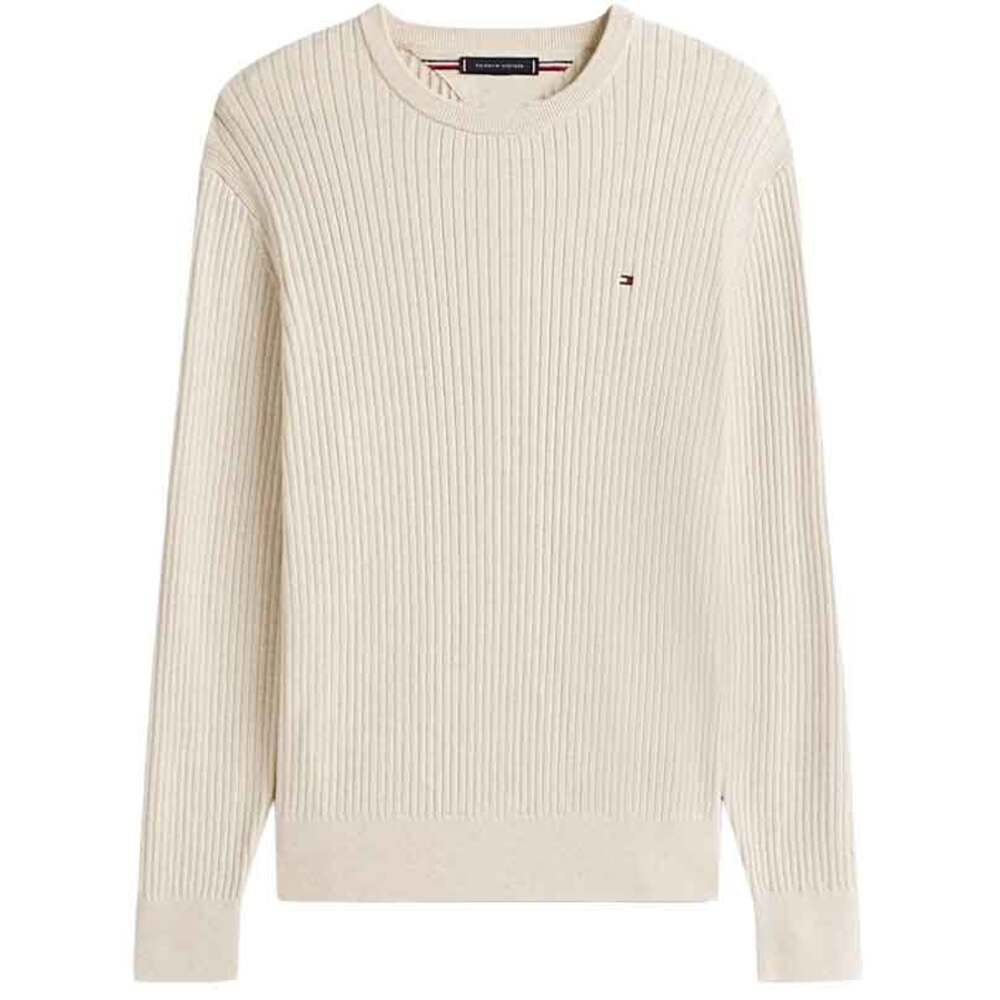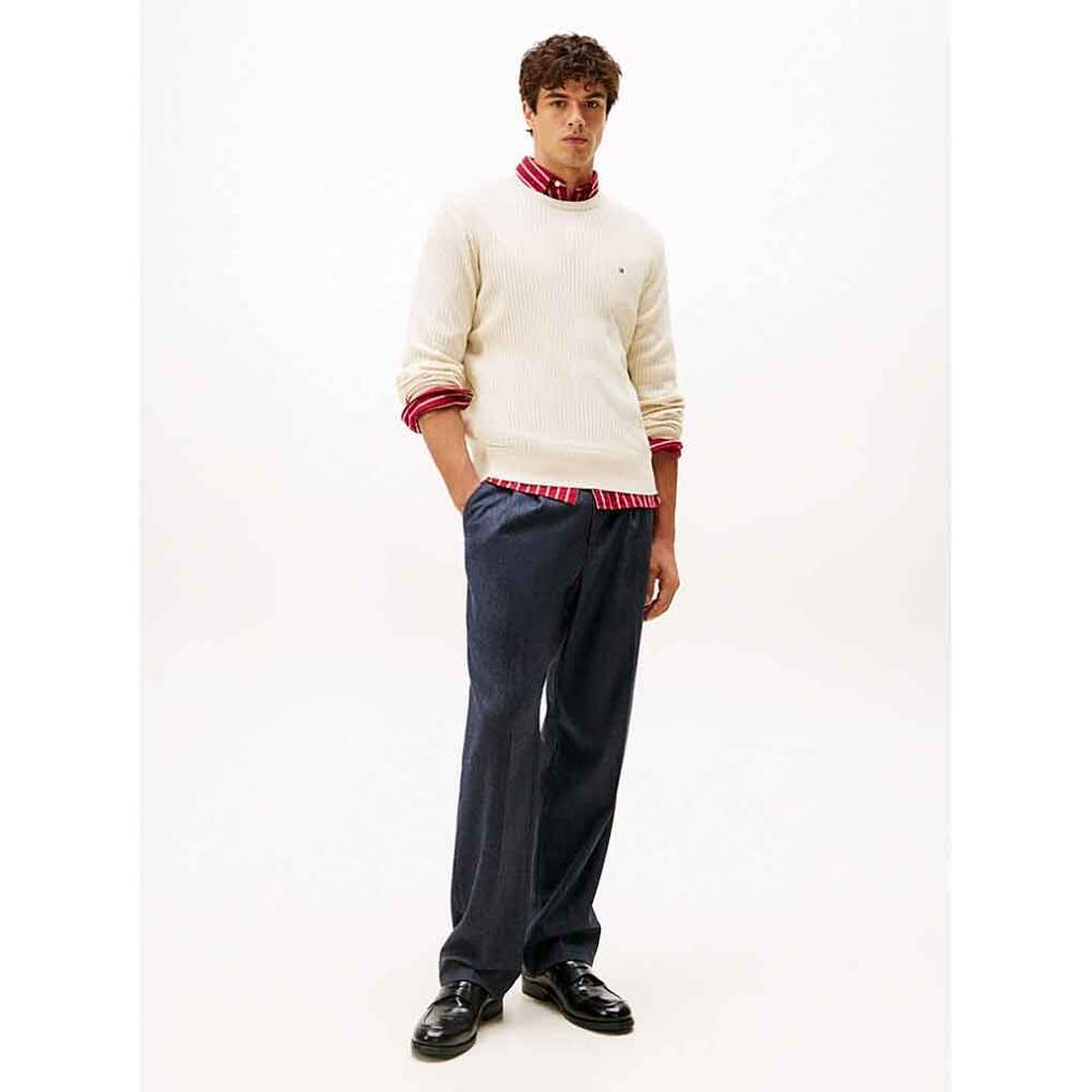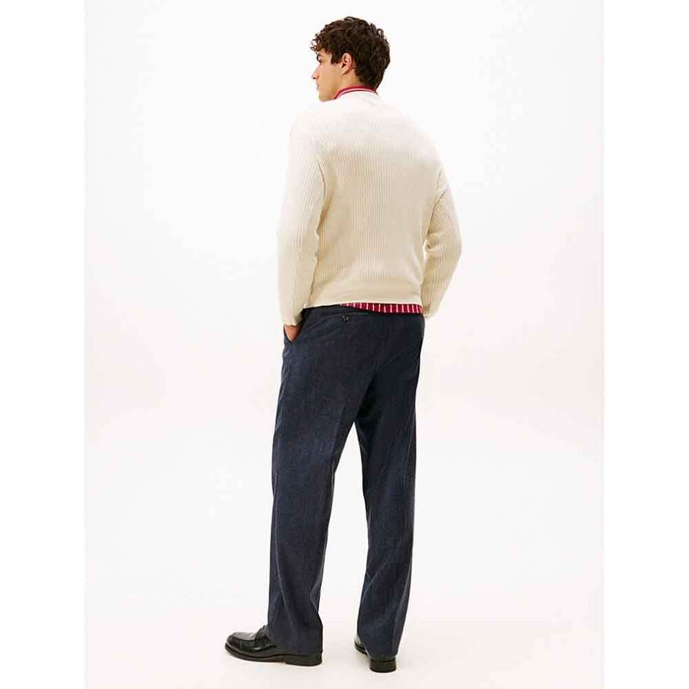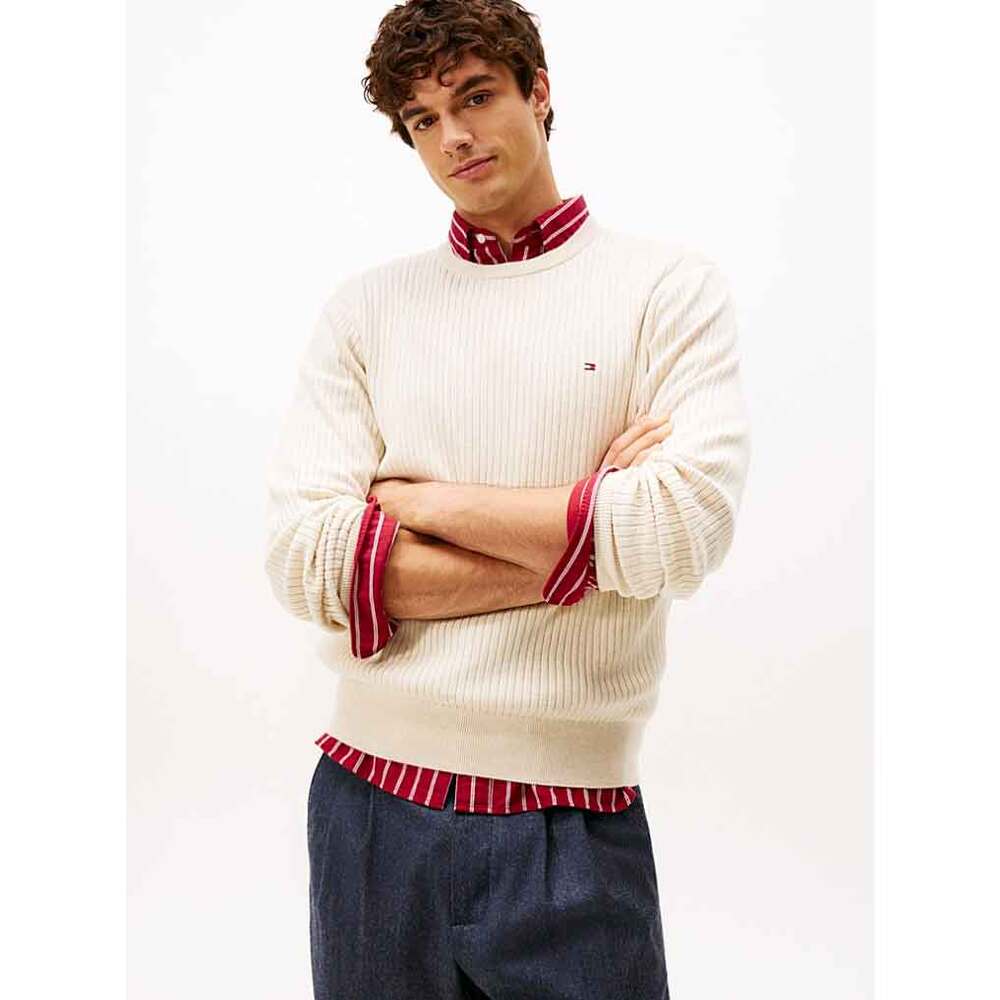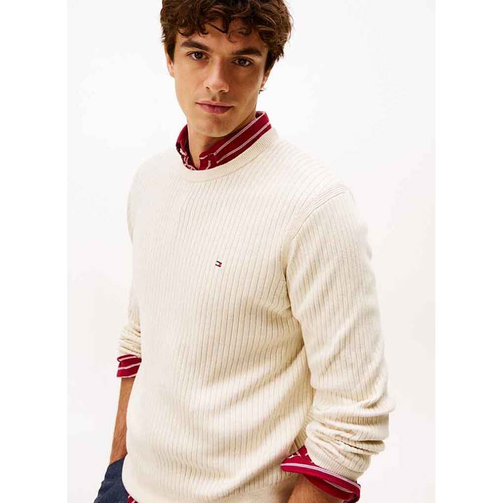 La lavorazione a coste all over dona carattere e struttura al tessuto, mentre il girocollo classico e le spalle leggermente scese conferiscono un look casual ma elegante. L'iconico nastro interno al collo e la bandierina ricamata Tommy Hilfiger sul petto sottolineano l'inconfondibile identità del brand.